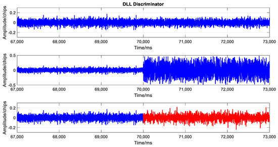 Delay lock loop (DLL) discriminator in the three scenarios. From top to bottom: (top) when no attacks exist, (middle) actual signal cancelled, and (bottom) actual signal cancelled and spoofing signal modulated. Blue and red points represent the outputs of actual and spoofing signal, respectively.