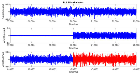 Phase lock loop (PLL discriminator in the three scenarios. From top to bottom: (top) when no attacks exist, (middle) actual signal cancelled, and (bottom) actual signal cancelled and spoofing signal modulated. Blue and red points represent the outputs of actual and spoofing signal, respectively.