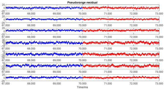 Pseudo-range residuals in every tracking channels (for 7 satellite observations). The blue and red points represent the outputs of actual and spoofing signal, respectively.