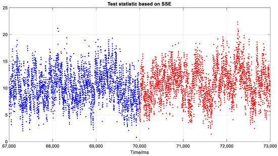 Test statistics based on squares of the residual errors (SSE). Blue and red points represent the outputs of actual and spoofing signal, respectively.