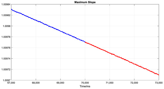 Test statistics and maximum slope are important parameters for classical RAIM fault detection and protection level check. The spoofing detection alarm in RAIM will be triggered only when the test statistics exceeds a threshold. As shown in Figure 13, there was no obvious change before and after the transition point, and the threshold was hard to be set in this circumstance. The maximum slope shown in Figure 14 also kept the same trend after the spoofing attack began, which verified the time consistency of the geometry matrix further.