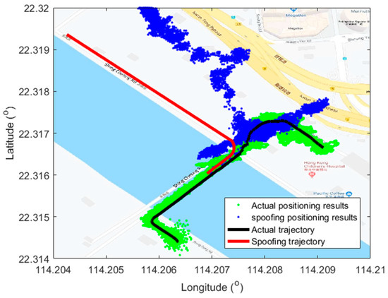 The act and purpose of spoofing is not only to affect the victim receiver to output the wrong positioning solutions, but also to mislead the receiver to the spoofing trajectory. Actually, the hazard of this type of spoofing attack is much more serious compared to those of the conventional overlapped spoofing attack. The positioning outputs before and after the spoofing attack are shown in Figure 7, also plotted on a Google map.