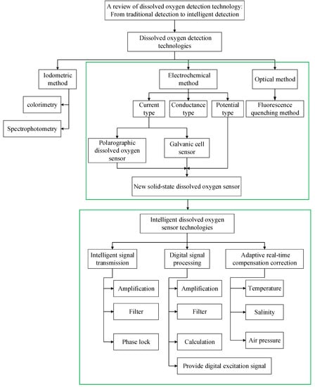 Wang introduced the principle, materials, advantages and disadvantages, and further development of the Winkler–Clark electrode and fluorescence quenching dissolved oxygen detection method. Although compensation was mentioned, no specific introduction was given and no intelligent concept was introduced []. Wang introduced optical oxygen sensors of various principles in a very comprehensive and detailed way, including the development of the new materials used by these sensors, the development of the sensor mode, and their applications in various fields []. Unlike those reviews, this review focuses on the intelligence of dissolved oxygen sensors. By comparing the three detection technologies and their improvement methods, it is highlighted that the fluorescence quenching dissolved oxygen sensor based on optical fiber has better performance, but the accuracy and real-time performance still cannot meet the requirements of in situ long-term online measurement; thus, the market is driving the development of optical dissolved oxygen sensor toward an intelligent direction. The full article framework is shown in Figure 1. Firstly, the principle, application, improvement, advantages, and disadvantages of iodine titration, the electrochemical method, and the photochemical method are introduced. Electrochemical and photochemical methods can be used to detect dissolved oxygen online, but they are not suitable for accurate and real-time in situ detection. Therefore, intelligent detection technology of dissolved oxygen is further studied from three aspects: intelligent signal transmission, digital signal processing, and adaptive real-time compensation.