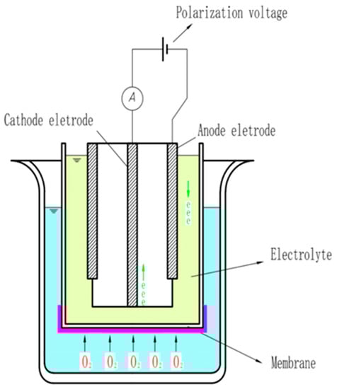 Polarography is a method for determining the concentration of substances in solution by measuring the current–potential (or potential–time) curve of polarized electrodes during electrolysis. Initially, the polarographic sensor only used a pair of bare electrodes to measure the dissolved oxygen, and the electrode was immersed directly in the solution; thus, the surface of the electrode was easily contaminated by impurities in the solution to be tested. Subsequently, Clark proposed a film-coated electrode wrapped with a polymer plastic film and improved the structure of the polarographic electrode. As shown in Figure 2, the probe of the current polarographic dissolved oxygen sensor is mainly composed of working and auxiliary electrodes, an air-permeable film, and an intracellular electrolyte, and wires are added between the two electrodes to form a loop. When a voltage is applied between the working and the auxiliary electrodes, oxygen molecules are reduced on the working electrode, allowing more oxygen atoms to pass through the selective air-permeable film, thus forming a diffusion current. Polarographic sensors are widely used because they overcome the problem that the electrode is easily polluted in the early stage. The specific reaction process of the working and auxiliary electrodes is expressed by the following chemical equations: