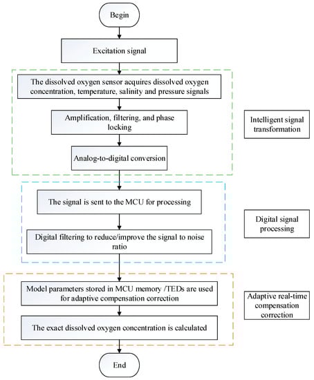 The signal processing flow of the intelligent dissolved oxygen sensor.