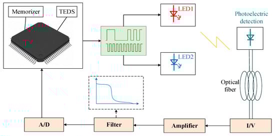 Wu adopted digital signal processing technology, namely, the finite impulse response (FIR) digital filter, to filter weak fluorescence signals in the detection system and remove high-frequency noise []. Lo proposed a fluorescence sensor using an optical fiber as the conducting material. The system used digital signal processing technology to modulate the LED in the light source part and a digital signal processing chip to enhance the measurement of the fluorescence signal, reducing the bending loss in the optical fiber transmission process []. A 256-point complex fast Fourier transform (FFT) was used to convert the time-domain data into the frequency domain by the digital signal processor (DSP) chip, and digital signal averaging and FFT filtering were used to improve the SNR of the sensor and significantly reduce the background noise. The capability of the system to alleviate fiber bend loss was demonstrated.