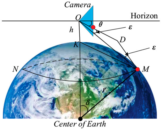 In navigation, the ship is sailing in a large circle at sea; the tester with an eye height of h sees that the farthest sea and the sky intersect into a circle, which is called the tester’s visible horizon, that is, the SSL. In ship vision, we use cameras instead of human eyes for sea target detection and identification. Assuming that the installation position of the camera is h from the sea level, the geometric relationship can be obtained considering the curvature of the earth and the difference of atmosphere refraction, as shown in Figure 2. The circle MN represents the SSL and the blue triangle represents the camera. Before using it, we finished camera calibration and distortion correction [32]. Therefore, in this analysis, we suppose the optical axis of the camera is parallel to the horizontal plane, which is called the initial state of the camera motion. The point O is the camera center, the point K is the projection of the point O at the sea level, r represents the radius of the earth, represents the angle of the ball, represents the difference of atmosphere refraction, the difference in the navigation is (1/13) , and the straight line OM represents the actual distance from camera to the SSL instead of , which is expressed by . In the triangle ∆OKM, since both and are small angles, we can approximate and , and can be obtained by Equation (1). According to the 1 nautical mile representing 1852 meters in navigation, it can be inferred that the r is 6366707 m. The position angle of the SSL in the camera can be obtained by Equation (2).