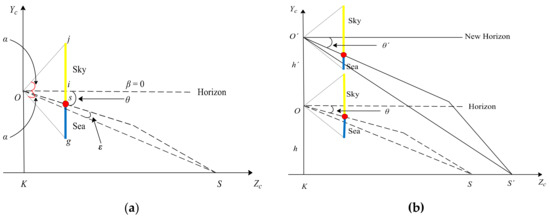 Geometric relationship between the sea–sky line (SSL) position and the camera position. (a) Geometric relationship under the initial state. (b) Geometric relationship under the camera heaving motion.