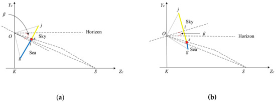 Under the condition of maintaining the initial state, we assume the sea level as a plane according to Figure 2, and obtain the geometric relationship as shown in Figure 3a. The triangle represents the camera. In the imaging plane of the camera, the line js represents the sky area, the line sg represents the sea area, the point s represents the projection point of the SSL, and the point i represents the center point, which is also taken as the origin (0, 0) of the image coordinate system. Assuming that the pitch angle of the camera is represented by , the camera’s vertical viewing angle is represented by 2 , the longitudinal width of the imaging plane of the camera is w, and the position of the SSL in the image is represented by , and can be obtained by: