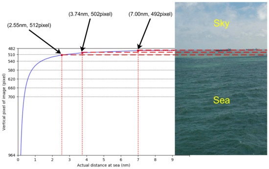 In order to estimate the CR of the SSL, we need to change from the camera coordinate system to the image coordinate system; that is, the coordinate origin moves from the center point to the upper left corner. Then, we begin to explore the relationship between the pixel points on the image and the actual distance at sea. First, we find the position of the SSL on the image in the current coordinate system, as shown in Equation (10), where represents the pixel points on the image. Then, through Equations (1) and (10), we can obtain the relationship between and the actual distance at sea, as shown in Equation (11). Assuming h = 20 m, the camera parameters are w = 964 pixels and = 3.7°, and the relationship between D and can be obtained as shown in Figure 6, where horizontal and vertical coordinates represent D and respectively. Since we only want to show the relationship between the SSL and the sea area, the value of the ordinate is from the center of the image to the bottom, so the range is [482, 964]. From Figure 6, it can be seen that the closer to the SSL, the larger the actual distance represented by each pixel. A distance of 2.55 nm or beyond from the camera can be represented by 30 pixels on the image.