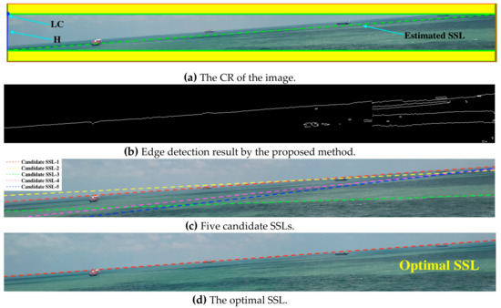 Assuming l = 1288 pixels, = 5.0°, and = 0.4, the relevant parameters of the cost function are shown in Table 2. We know SSL-1 is the optimal SSL and display it in the original image as shown in Figure 7d.