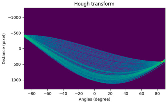 The Hough transform is used to display the edge detection result in the accumulator. As shown in Figure 8, the horizontal coordinate represents the polar angle () and the vertical coordinate represents the polar diameter (, and each curve represents a point in the edge image. The brighter the point, the more the number of curves (represented by ) that pass through this point, indicating that the more points are collinear in the edge image. In this paper, we optimize the SSL extraction algorithm by combining the prediction results calculated by Hough transform according to the SSL length, with the measurement results provided by the inertial sensor according to the SSL angle. The specific algorithm is as follows: