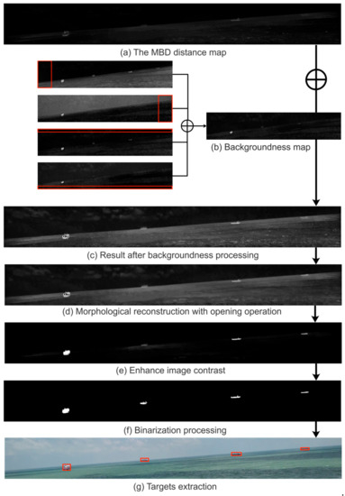 A processing case for targets detection. (a) is obtained by fusing the average values of the MBD maps of the three channels L, a, and b. In (b), each red box represents 10% of the image area in the four directions of up, down, left, and right, and represents the average of the four images after adding. (d,e) represent post-processing, where . (f,g) represent foreground segmentation, where the binarization threshold is 5 times the average intensity of (e), and the area threshold is 100 pixels.