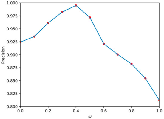 This experiment was mainly to verify the effect of length and angle on the cost function at the stage of SSL extraction. In the train set, we set the value of to [0, 0.1, 0.2, 0.3, 0.4, 0.5, 0.6, 0.7, 0.8, 0.9, 1.0], found the minimum cost function for each value, and drew the corresponding SSL. According to the evaluation metrics of the SSL, the average precision (AP) of the SSL under each is shown in Figure 11. It can be seen that when = 0.4, the extracted SSL had the highest AP, reaching 99.5%, but when only the length factor of the SSL was considered, the AP was the lowest with just 81.23%. Therefore, it can be concluded that the influence of the angle is greater than the length in the cost function extracted by the SSL.