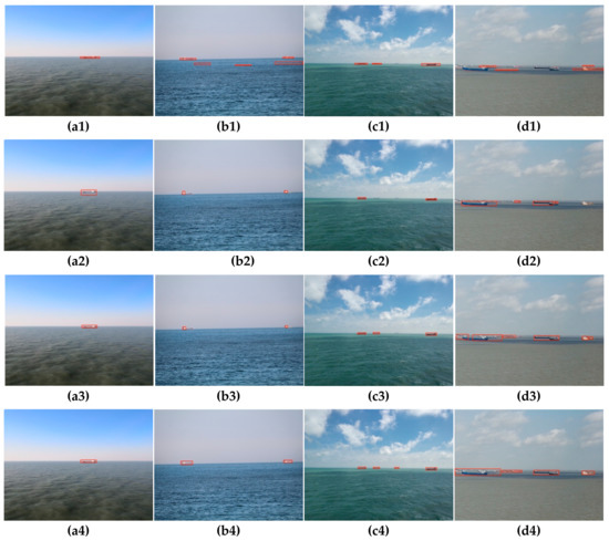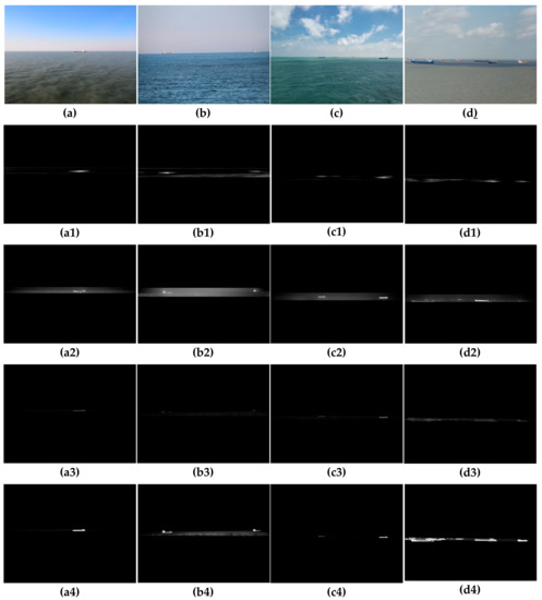 Figure 13 shows the detection performance of several methods on different datasets of the train set. It can be seen that although the residual spectrum (Figure 13(a1–d1)) obtained by the SR method can detect the ship, it does not accurately indicate the position and shape of the target ship, and is liable to cause false detection. The RBD method achieves better detection results when the number of targets in the image is small, as shown in Figure 13(a2,b2), but it is easy to cause missed detection when there are many targets, such as Figure 13(c2,d2). The traditional FMBD method (Figure 13(a3–d3)) can detect the salient targets well, but the contrast between the target and the background is not obvious enough, which is not conducive to subsequent target extraction. The proposed method (Figure 13(a4–d4)) in this paper can clearly distinguish the target and background, accurately detect the shape and position of the target, and the detection performance is the best.