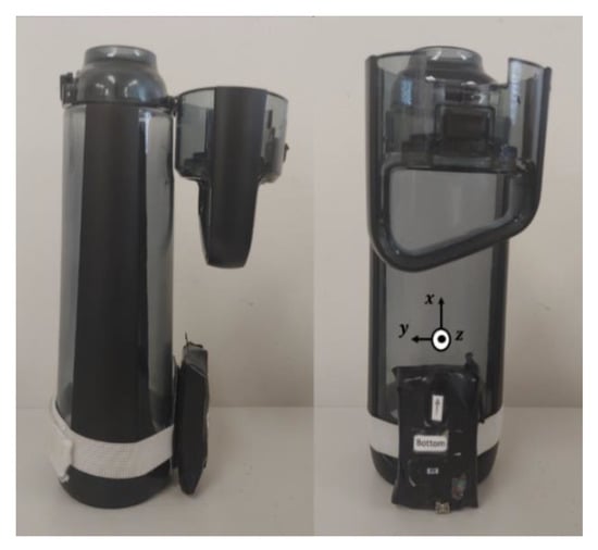 A prototype sensor module consisting of a triaxial accelerometer (ADXL345, Analog Devices, Norwood, MA, USA), gyroscope (InvenSense IMU-3000, TDK, San Jose, CA, USA), and 802.15.4 wireless transceiver (IRIS Mote Module, MEMSIC, Andover, MA, USA) was connected to the refillable bottle, as depicted in Figure 1, for all experiments. Only data from the accelerometer was used within the current work. The sensor was placed beneath the lid at the bottom of the bottle to avoid interference with gripping. The local coordinate frame of the sensor was aligned with the bottle geometry as follows: (1) the x axis was aligned parallel to the vertical axis of the bottle, such that the accelerometer signal only consisted of the static acceleration due to gravity when the bottle was placed stationary on a level surface (i.e.: a = gx), (2) the y and z axes were aligned parallel and normal to the surface of the bottle, respectively.