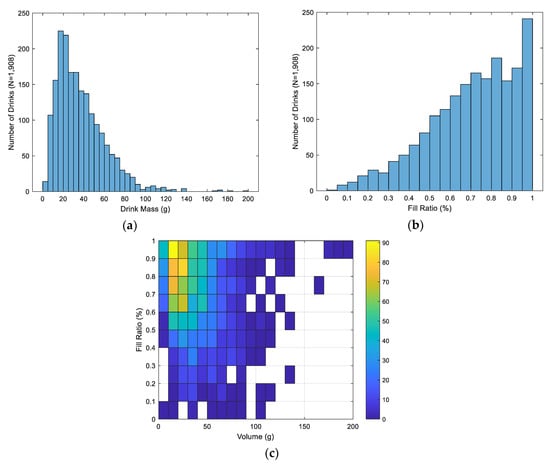 All subject recruitment, data collection, and record storage was conducted according to protocol approved by the Institutional Research Board at Michigan State University. The univariate distribution of the initial fill ratio (fill level normalized to total fillable height) and mass of each drink collected, along with their joint distribution, are depicted in Figure 2. As shown, drink instances are skewed towards larger fill ratios due to the protocol of filling the bottle completely at the beginning of each trial. The volume distribution is right skewed due to the variability in large drink consumption across individuals.