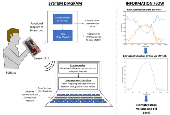 Data from the sensor module was transmitted to a base station (IRIS Wireless measurement system, MEMSIC, Andover, MA, USA) connected to a PC via USB at a target polling frequency of 20 Hz. All files were processed offline using MATLAB (Mathworks, Natick, MA, USA). A diagram of the collection system is shown in Figure 3.