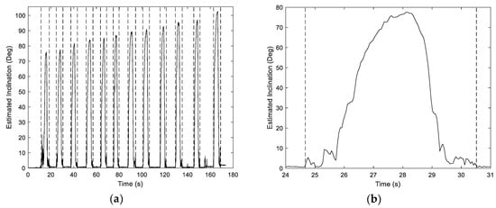 (a) Variation in estimated container inclination over an experimental trial (wide view); (b) zoom view for drink 2.