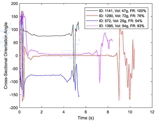 Position of the sensor in the cross-sectional plane of the bottle for four randomly chosen drinks (stationary intervals indicate a lack of rotation about the vertical axis of the bottle).