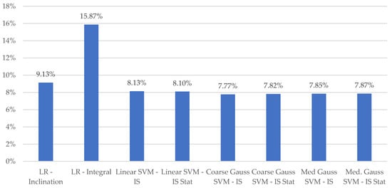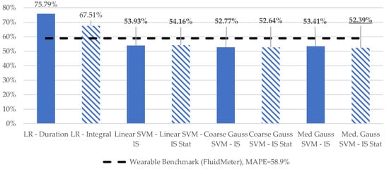 Variation in MAPE for the various learning models considered is depicted in Figure 7. Models computed for the sip micro-event only are labeled as Stat., with all other reported results computed for the entire macro-event duration. Consistent with the wearable results in [14], LR models employing the integral of inclination outperformed those using duration. The level of improvement is enhanced versus the results presented in [14]. We hypothesize that this difference is associated with the use of the inclination estimate of the container, as opposed to the individual accelerometer channels which are related to this quantity.