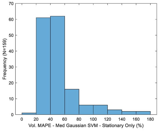 Variation in MAPE across trials is depicted in Figure 8 for the best-case volume estimator (medium kernel, sip micro-event partition). Consistent with prior observations [14], dispersion in the observed error metric is substantial, with a standard deviation of 28.18%.