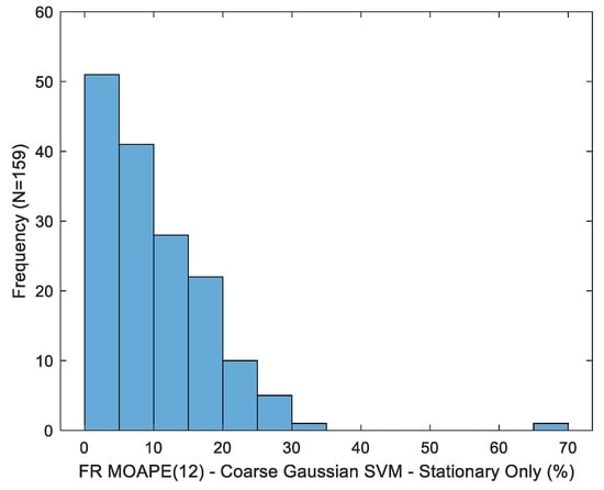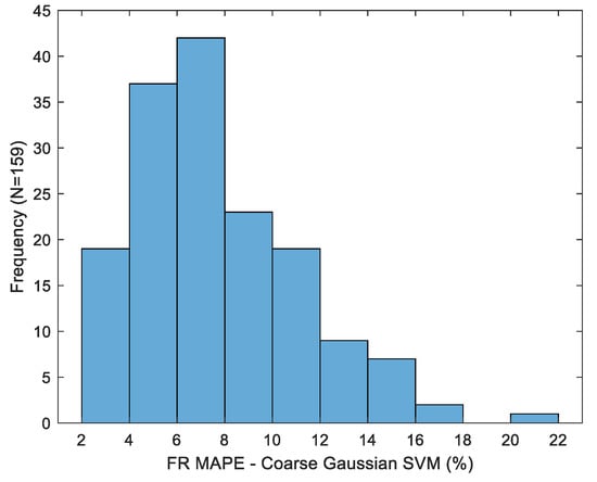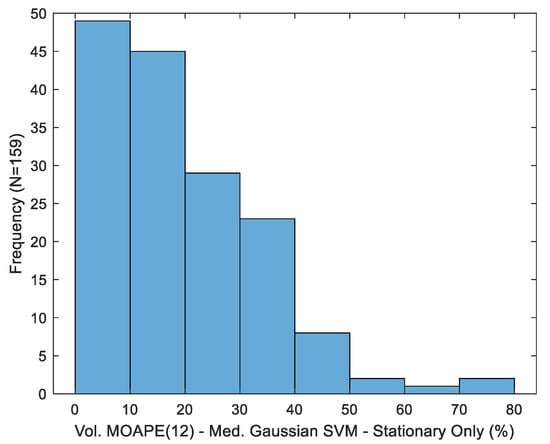 Variation in fill ratio MAPE for the multiple models considered is depicted in Figure 10. Sip duration was replaced with maximum inclination for a single-factor LR benchmark model due to its strong correlation with the fill ratio. This relationship is emphasized by the considerable increase in this quantity over the course of the experiment, as shown in Figure 4. Fill ratio estimation accuracy is greatly improved versus volume prediction for both the single factor regression and more complex SVM models. Variability in MAPE for the best-case estimator (coarse kernel, entire macro-event partition) is shown in Figure 11. Error dispersion across trials is greatly reduced versus volume estimators. Namely, the fill ratio MAPE standard deviation is 3.39%, versus 28.18% for the best-case volume MAPE.