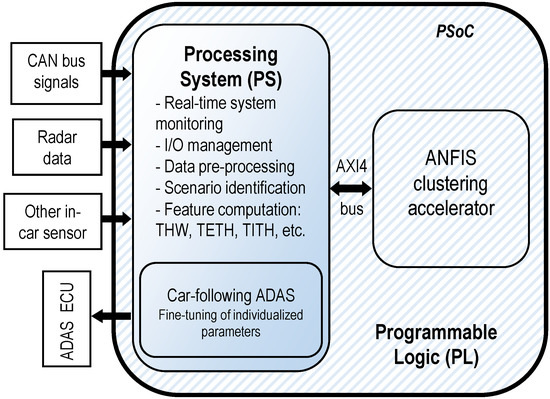Thus, in summary, and according to Figure 2, the PS executes the tasks of interfacing with the vehicle buses to collect the input data, computes selected identification features, sends them to the ANFIS accelerator deployed in the PL through AXI4 bus, collects the outputs of the accelerator, computes the personalized ACC parameters, and sends them to the ACC module. On the other hand, as it is computationally intensive, the PL implements an ANFIS-based classification that needs to be executed as fast as possible. Using this architecture, in Section 5, an ACC application with personalized behavior is presented.