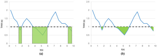 where T is the total time interval considered, is a binary activation parameter, is the sampling period, is the instantaneous value of THW at a given moment t, and is the predefined safety threshold value (Figure 4a). On the other hand, TITH (Equation (4)), is the summation of the difference between and restricted to time intervals when (Figure 4b).