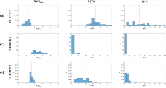 Histogram of , TETH, and TITH values distribution for (a) Cluster 1, (b) Cluster 2, and (c) Cluster 3. Red line represents average value of each distribution.
