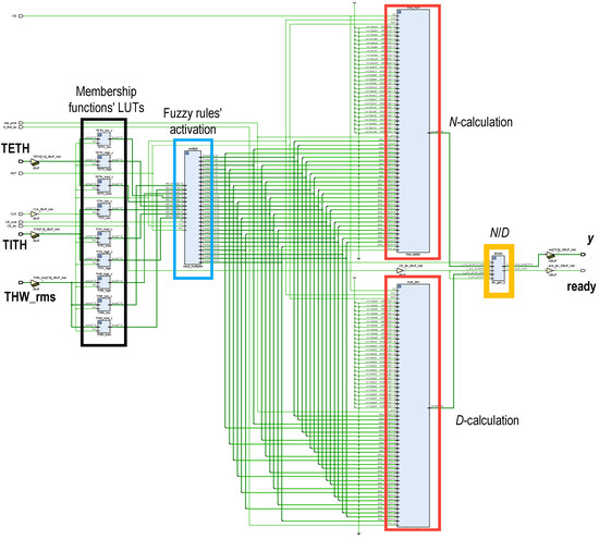 The generalized bell-shaped membership functions were precalculated and stored as look-up tables (LUTs) (remarked in black in Figure 8) at the PL block RAMs (BRAMs). Therefore, evaluation of the input membership to each antecedent was straightforwardly obtained by addressing those values, lasting only one clock cycle. Once the input membership functions were evaluated, fuzzy-rule activations were calculated. As there were three membership functions for each of the three inputs, 27 weights were to be computed. These fuzzy-rule activations were three-input products, computed by a fuzzy-rule activation module remarked in blue in Figure 8. These products were efficiently computed by a full-VHDL design intended to only use Xilinx DSP resources [60], improving timing performance. To achieve this DSP-only implementation, the three-input products were done two by two. Thus, first the product of two of the inputs was calculated and stored in an intermediate result pipeline register and second, the stored partial product was multiplied by the remaining input and saved in the output register. This product pipeline required two clock cycles.