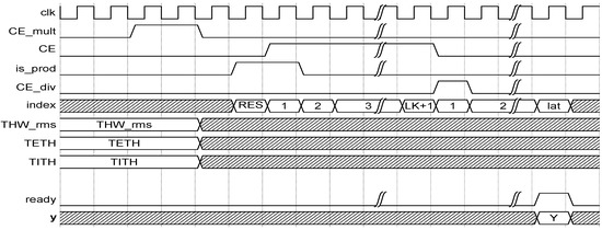 In the work by the authors of [61], a high-performance product–architecture sum, developed by the authors, was described. This topology, shown in Figure 9, replaced the tree-adder architecture. It was intended to minimize latency, save resources, and minimize the number of used DSPs. Thus, for a given number k of products, the proposed architecture only used k multiplier/adder blocks, while a tree adder would spend of the same hardware resources. This architecture, with inputs and , control signals is_prod and CE, and output p operates as follows.