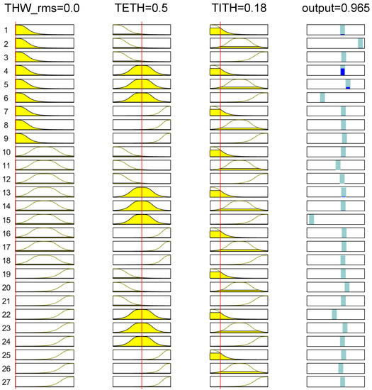 In this particular application, there are inputs (, , and ), whereas for each of the inputs, three linguistic labels, namely, , , and , were assigned and 27 rules were generated (). Membership functions associated to these labels are bell-shaped functions, which are defined as follows,