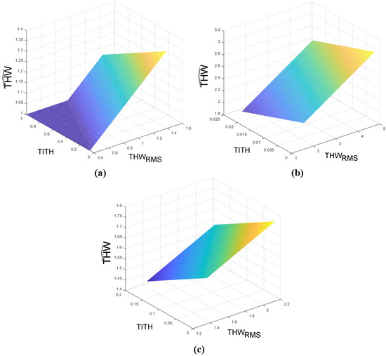 For each cluster, the point of minimum and maximum TITH were assigned with a value of , as it corresponded to drivers from that cluster who like to drive with a shorter time gap. On the other hand, drivers who would rather drive with longer time gaps (that is, those who are represented by the point of maximum and minimum TITH), have a value of assigned. Finally, intermediate drivers (average values of and TITH), have a value of . Consequently, three points that defined each THW-modeling plane i are as follows.