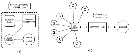 Figure 1a shows a basic block diagram of a sensor and control node. This includes a low-power microprocessor, an RFM69 radio module for wireless communication, a sensor or control device, an optional switch which can deactivate the sensors when needed for achieving lower power consumption, and a power source, which is typically a lithium ion polymer battery or 5 V power either from USB or any commercial power adapter.