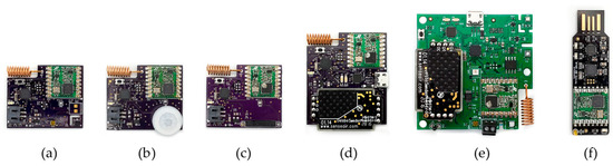 Low-power wireless sensor nodes measuring (a) temperature, relative humidity, and light intensity, (b) motion/room occupancy, (c) door/window opening, and (d) CO2 concentration; (e) an IAQ monitor with extended capabilities; and (f) USB gateway receiver for all wireless sensor nodes.