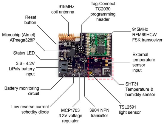 The red dotted box shown in Figure 3 indicates the part of the board where sensors are placed. Most sensor nodes utilize a similar board design, with components in the red box being replaced by other types of sensors to create nodes that measure various other things. Depending on the cost, measurement requirements, type of sensors, and final placement of the sensor node itself, one or more sensors can be combined into a single board, as shown in Figure 2e. Table 1 lists the components on the wireless sensor boards shown in Figure 2, along with their typical unit costs. The component costs vary depending on market supply and demand, distributer location and political factors. When sourcing components in quantity for mid-scale manufacturing, the component prices sharply decrease. Table 2 lists total cost for each of the wireless sensor nodes shown in Figure 2a–f, along with the backhaul.