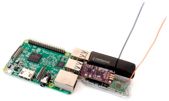 Another fundamental part of the Elemental platform is a Raspberry Pi 3B, which is used as a central backhaul, shown in Figure 4. The Raspberry Pi is a miniature single-board computer with peripherals for internet connectivity running open-source software. The goal of this backhaul is to allow data monitoring and control of a multitude of devices over differing protocols in a single place. It captures all incoming wireless sensor data using gateways in the form of USB sticks that can be easily plugged in. A wireless gateway as shown in Figure 2f is configured to send and receive data via the RFM69HW radio module to allow communications with our wireless sensors and control nodes. Other existing gateways that are compatible with the backhaul are described in Section 2.4 and its firmware is described in Section 3.1.