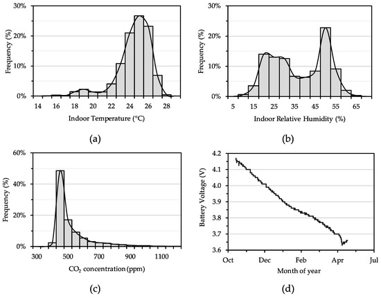 Histograms showing frequency distributions of 15-min averages of indoor (a) temperature, (b) relative humidity, and (c) CO2 concentration, and (d) initial battery life (voltage over time) for a sensor node deployed in a research lab and office space for ~12 months.