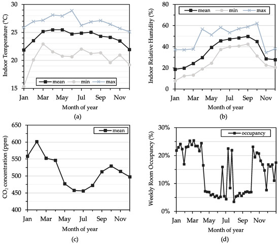 Annual trends showing monthly (a) temperature, (b) relative humidity, (c) CO2 concentration, and (d) weekly occupancy percentage in a research lab and student office space in an academic building.