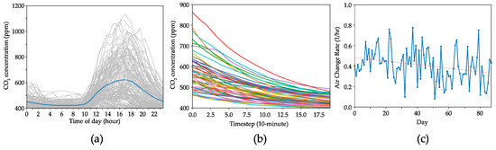 Additionally, since InfluxDB is specifically designed for handling time-series data, querying this amount of data is relatively quick, even on a slower spinning hard drive. This allows for fast data analysis when needed. An example of such data analysis is shown in Figure 9a. From the raw time-series data summarized in Figure 7, around three months (Feb-May) of daily CO2 data was extracted and shown in Figure 9a, with the blue line indicating the average diurnal CO2 trend during this time period. Next, a Python script was written to automatically analyse the data and extract the natural decay of built-up CO2 (generated by occupants) at the end of every day (Figure 9b). Air change rates (ACRs), or the rate of turnover or dilution of indoor air, from these decay data are then automatically calculated and plotted in Figure 9c. The trend in ACRs over this time period indicates their correlation with varying indoor-outdoor temperature differences as the weather changes from winter to spring, which is consistent with indoor/outdoor temperature differences and varying wind conditions as key driving forces of air infiltration in buildings [55]. This is just one example of how the Elemental platform can be used to collect large amounts of time-series data over long periods of time and how the data can be accessed for analysis and generation of useful information.