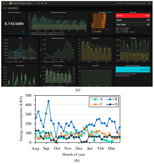 (a) Grafana—data monitoring platform in Brood used for monitoring air quality, energy and building systems in a residential setting and (b) 8 months of weekly energy consumption data in four apartments.