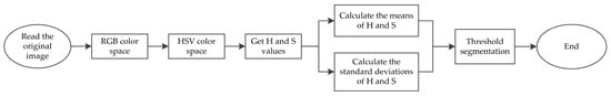 Color space threshold segmentation is required after conversion to the HSV color space. Figure 3 shows the color space threshold segmentation step diagram.