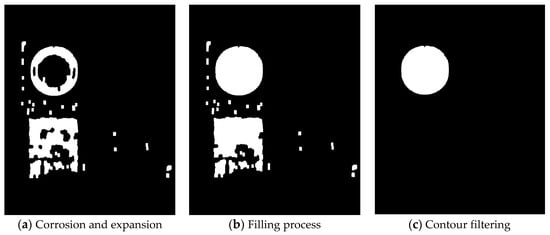 In the actual road scenes, traffic signs do not exist independently. Colorful clothes of pedestrians and colored billboards are likely to be consistent with the color of traffic signs, thereby resulting in some useless interference to the binary image with threshold coarse segmentation. Therefore, filtering these interferences is necessary to achieve effective detection of the ROI. Figure 5 illustrates the morphological processing for binary images.