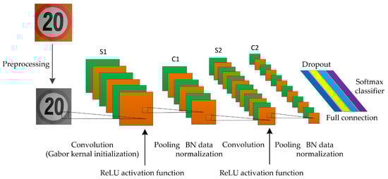 (1) The Gabor kernel is used as the initial convolutional kernel between the input layer and the first convolutional layer. In the actual road scenes, the change of light, the damage of traffic signs, and the obstruction of obstacles will affect the quality of the training image. Nonetheless, Gabor wavelet can solve such problems commendably. The Gabor wavelet is insensitive to changes in light; therefore, it has good adaptability to light. Furthermore, it has superior scale and direction selection characteristics that are sensitive to the edges of the training image.