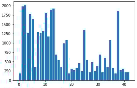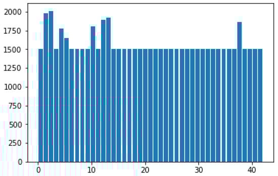 After image preprocessing, an artificial dataset must be generated for GTSRB. Given that the number of different types of traffic signs in GTSRB varies, this condition easily causes the imbalance of sample data. Different types of traffic signs have evident differences during classification and recognition, which affect the generalization of the entire network model. Generating an artificial dataset aims to construct a new artificial sample by randomly sampling from the value space of each attribute feature of the same sample type. Therefore, the number of different kinds of traffic signs is as equal as possible to solve the problem of sample data imbalance. After generating the artificial dataset, the 43 classes of traffic signs are shown in Figure 9.