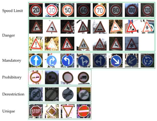 The traffic sign images in GTSRB are taken from the video captured by the vehicle-mounted camera. As shown in Figure 7, GTSRB includes 43 classes of traffic signs, and the number of different types of traffic signs varies. Each type of traffic sign corresponds to a catalogue, which contains a CSV file annotated with a class label and a single image of multiple tracks (each track includes 30 images). In accordance with the different instruction contents, GTSRB can also be divided into six categories: speed limit, danger, mandatory, prohibitory, derestriction and unique traffic signs as shown in Figure 8. The same type of traffic signs include different resolutions, illumination conditions, weather conditions, occlusion degree, tilt levels and other images, making the dataset more in line with the actual road scenes.