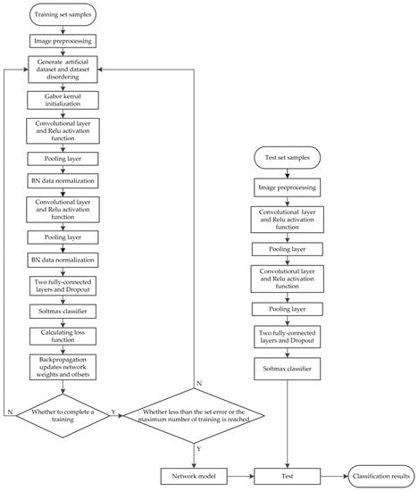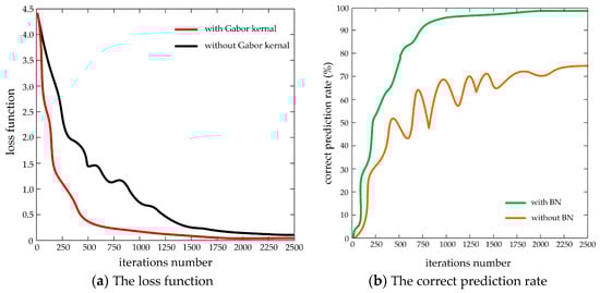 As shown in Figure 12a, in the improved Lenet-5 network model, with the deepening of the network iterations, the loss function corresponding to the Gabor kernel initialization is much falling faster than that without the Gabor kernel initialization, and drops smoothly to 0. The reason is that the Gabor filter can extract effective target contour information and remove useless image noise, thereby effectively avoiding over-fitting of the training data and reducing the computational complexity, and further enhance the robustness and adaptability of the network model. Without the Gabor filter, the training network can easily fall into the local optimal solution, which makes the updating of network parameters such as weights and offsets become slower. It can be seen from Figure 11 and Figure 12b that a good sample image classification prediction effect is achieved in the network training stage, and the correct prediction rate using BN data normalization increases with iteration number and the highest value can reach about 99.82%. When BN data normalization is not used, the correct prediction rate has a large fluctuation and the highest value is only about 75%. The reason is that after adding BN data normalization processing, not only can the gradient dispersion phenomenon be effectively avoided, but also the convergence speed of the training model can be accelerated, the training model is more stable, and the generalization ability can be considerably enhanced.