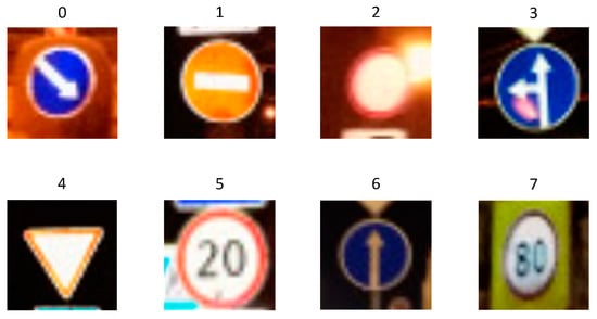 In the network testing stage, eight different traffic sign test images are randomly selected from the testing set samples and numbered automatically. Figure 13 shows the auto-numbered traffic sign test images.