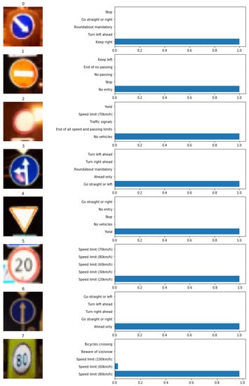It can be seen intuitively from the Figure 14 that the maximum probability recognition results of the eight traffic sign test images are completely consistent with their true meaning, and all of them have achieved effective recognition with an absolute probability close to 100%. The recognition results in the network testing stage show that the trained improved LeNet-5 CNN model has excellent classification and recognition ability, strong anti-jamming ability and high accuracy recognition rate for traffic sign dataset with different backgrounds and interferences, thereby reflecting admirable robustness and accuracy.
